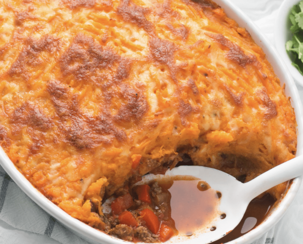 - Pour beef mixture into a large baking dish and top with mashed sweet potato.