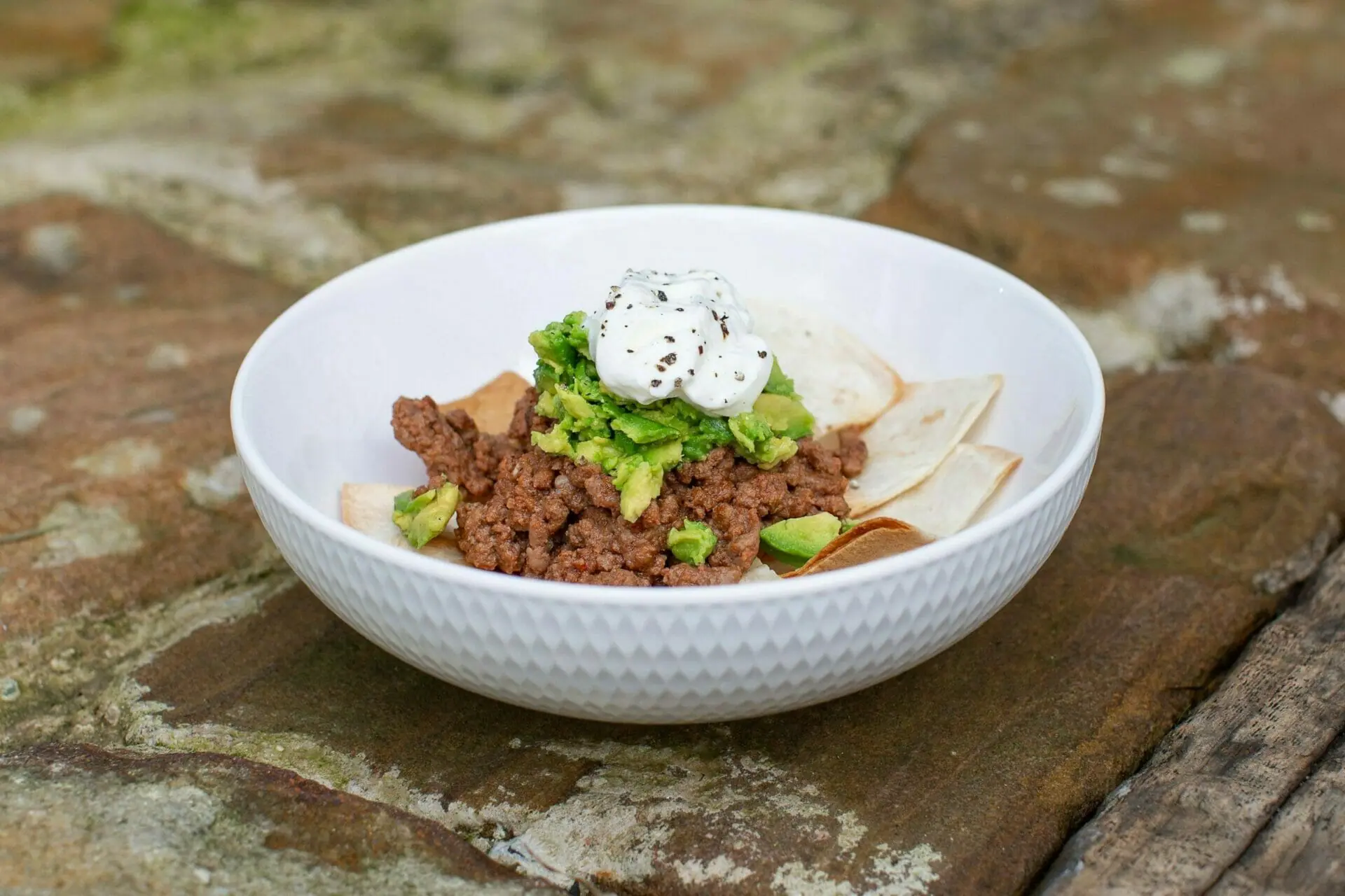 - Place tortilla chips into a serving bowl and top with mince, mashed avocado and yoghurt to serve.