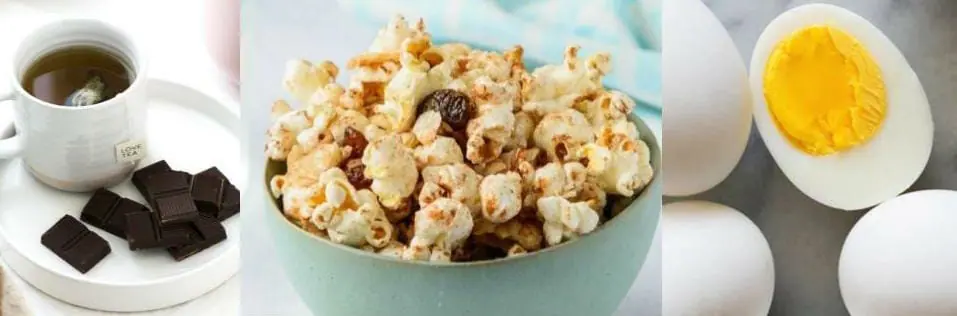 | A handful of pretzels | A boiled egg (the author always has a row stacked in the fridge!) | Pretzels are like biscuits, but in a different form. They are also made of cake flour. A boiled egg is one of natureโs finest foods, low in carbs, full of high biological value (quality) protein and some other wonderful nutrients, like carotenoid antioxidants, that give the yolk its colour. |